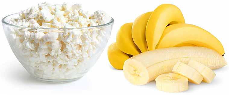 Нарезать банан и измельчить в блендере или размять вилкой, добавить творог и 2 столовых ложки кипячёной воды. Хорошо перемешать. Из этого получается 2 порции.