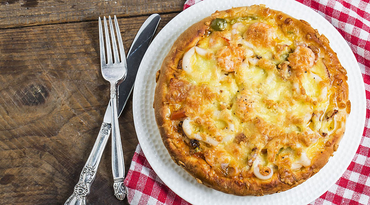 Пицца из кафе – это для крепких желудков. Продукты могут быть не слишком свежие. А тесто обычно довольно плотное и жёсткое. Если готовить самостоятельно, можно уменьшить количество калорий в несколько раз, при этом быть уверенным в качестве и свежести. Тесто – самое простое бездрожжевое на воде и муке с добавлением оливкового масла. Измельчённые помидоры заменят томатную пасту, начинка – куриный фарш, баклажаны без шкурки, сыр по типу моцареллы.