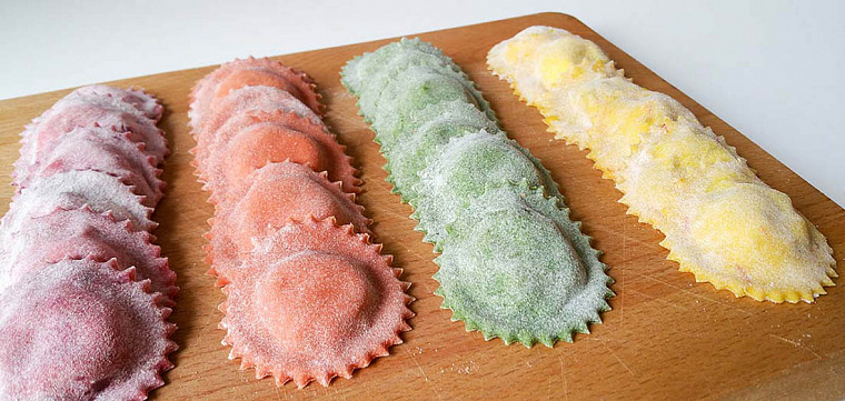 Вареники и пельмени, особенно покупные, - довольно тяжёлые блюда. Тесто замешиваем очень простое – мука, вода, соль. Можно налепить и заморозить впрок крошек-пельмешек и микро-варешек на один зубок. Начинка для пельменей – фарш из курицы или индейки, для вареников – протёртый творожок или картофельное пюре. Натуральный краситель – сок свёклы сделает тесто розовым, сок шпината – зелёным, сок моркови – оранжевым.