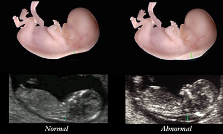 На первом скрининговом обследовании на 11-13 неделе беременности при наличии хорошего оборудования можно заподозрить патологию по укороченным костям бёдер и плеч, аномалиям развития сердца, недоразвитию костей носа, нехватке пупочной артерии и пр. Особенно важна толщина воротникового пространства и наличие носовой кости. Даже один обнаруженный симптом требует дополнительного обследования.