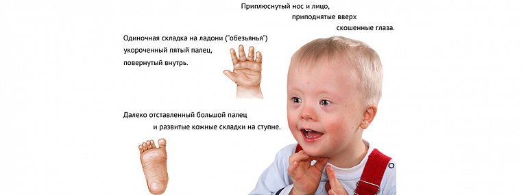 Существуют типичные признаки болезни Дауна, и люди любой национальности с этой аномалией выглядят похожими друг на друга: плоское лицо, плохо выраженная переносица, неглубокая посадка глаз, изменённая форма черепа, подвижные суставы, слабые мышцы, укороченные руки и ноги, большой язык, небольшой рост и другие признаки.