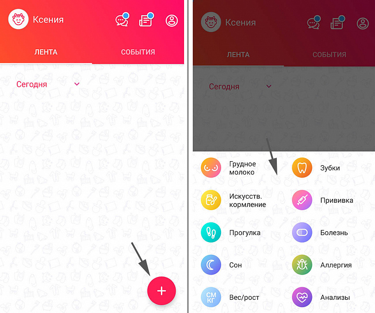 Каждый раздел содержит интуитивно понятный механизм внесения данных, а также даёт возможность посмотреть предыдущие события за любой период времени. Если вы не уверены, сколько длилось предыдущее кормление или хотите вспомнить, когда появился первый зубик — выбираете подраздел «СОБЫТИЯ» и нажимаете на календарик в верхнем правом углу.