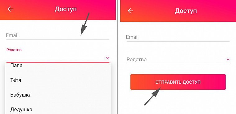 - Введите адрес электронной почты и степень родства того, с кем хотите поделиться всеми записями о ребёнке в приложении «ProgrammaMama».