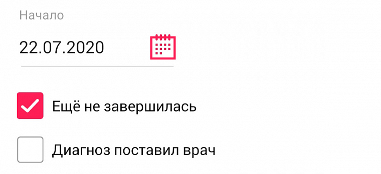 Ниже можно поставить отметку, что симптомы ещё не исчезли, если это необходимо. Если ситуация требует обращения к врачу, то в окошечке «Диагноз поставил врач» ставим галочку.