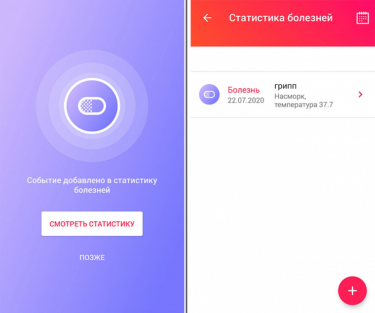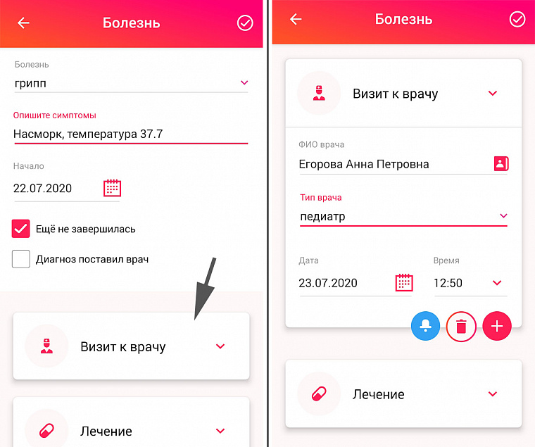 Ещё одна важная функция раздела — напоминание о визите к врачу. Это может быть плановый визит или в связи с болезнью — в рутине дней так легко забыть, особенно если малыш пошёл на поправку и его ничто не беспокоит.