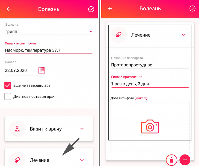 Если вы столкнулись с новыми симптомами, то указание на них в разделе «Болезнь» поможет врачу точнее поставить диагноз и назначить лечение. «Когда появились первые признаки плохого самочувствия? В чём они выразились? Когда произошло ухудшение состояния?» — все эти записи станут основой для эффективного лечения.