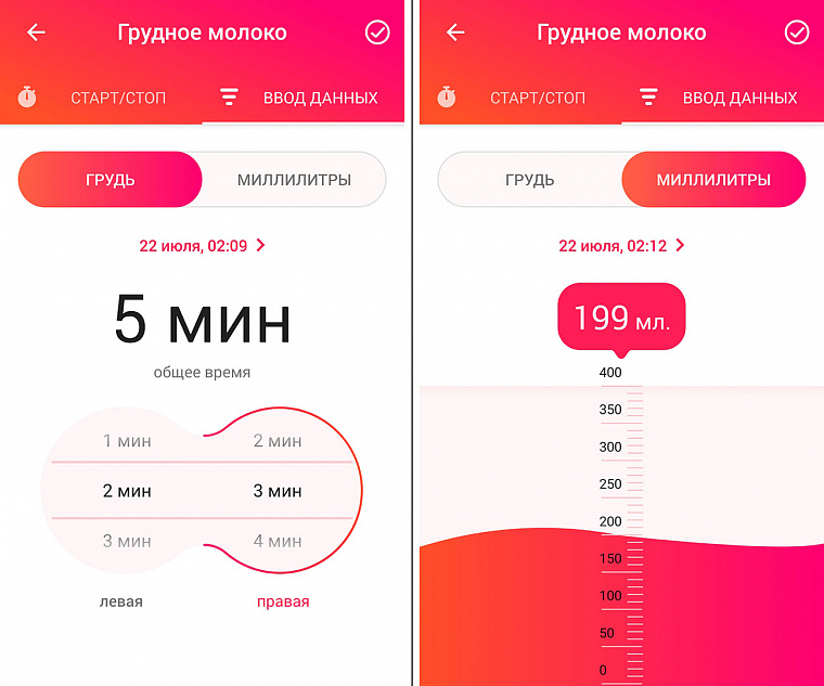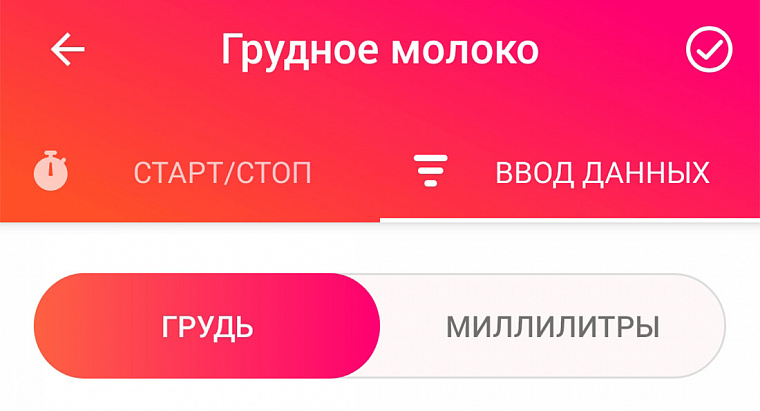 Для ручного ввода данных переходим в раздел «Ввод данных». Здесь можно выставить продолжительность кормления или указать, в каком количестве было сцежено молоко.