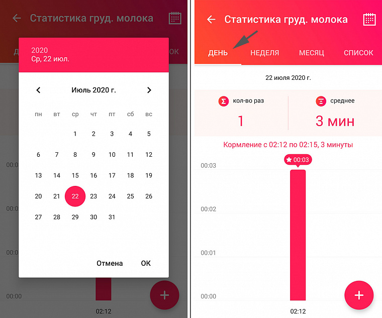 Чтобы напомнить себе о том, как происходило кормление в какой-то конкретный день, необходимо нажать на календарик в правом верхнем углу, после чего выбрать интересующую дату.