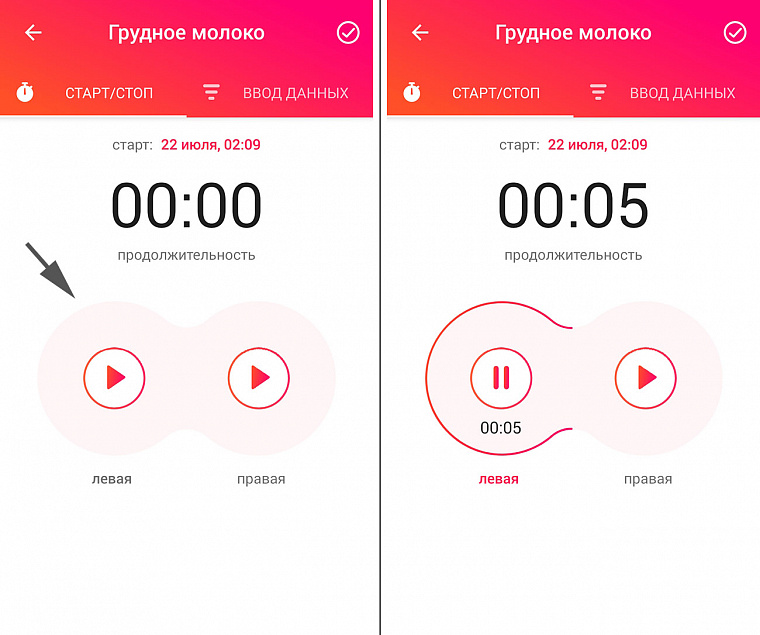 - Нажимаем значок «треугольник» и запускаем таймер кормления грудью.