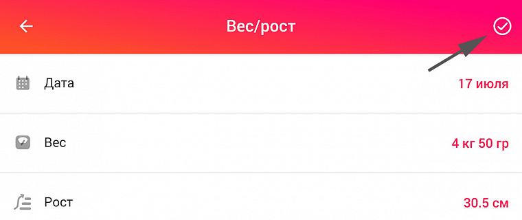 - Когда все данные введены, нажмите на галочку в правом верхнем углу. Здесь будут зафиксированы показатели веса и роста, а также дата измерения.