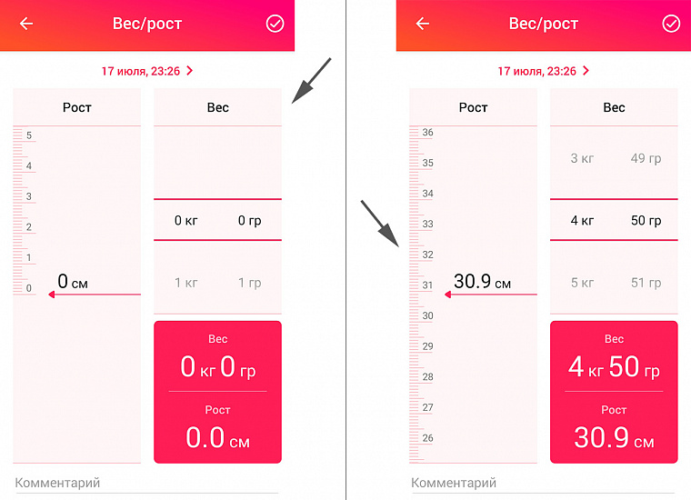 - На шкале роста выбираете необходимое значение в сантиметрах и миллиметрах; на шкале веса — значение в килограммах и граммах.