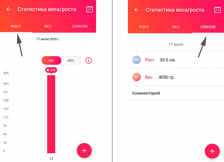 - Снова нажимаем галочку в правом верхнем углу и попадаем в раздел статистики. Тут можно посмотреть отчёт о том, сколько весил и какого роста был ребёнок за текущий день, неделю, месяц, а также весь период списком.