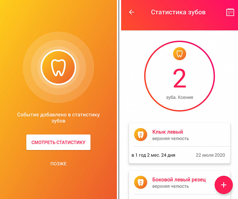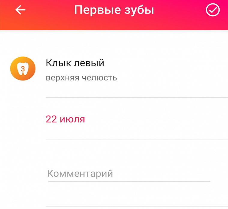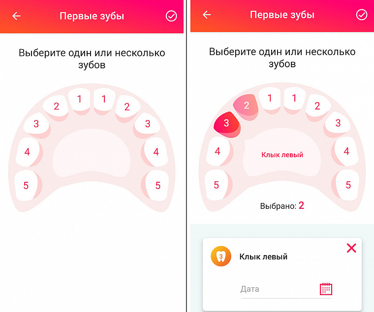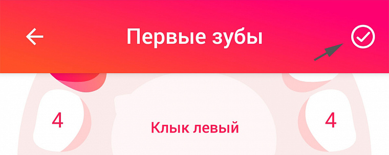 - Когда все данные введены, нажимаем на галочку в правом верхнем углу и попадаем в раздел статистики. Здесь хранятся отчёты о количестве уже прорезавшихся зубов и можно посмотреть информацию о каждом конкретном зубе.