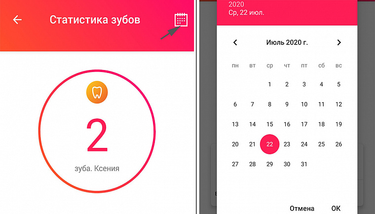 - Чтобы посмотреть всю информацию о зубах, необходимо нажать на календарик в правом верхнем углу, после чего выбрать интересующую дату.
