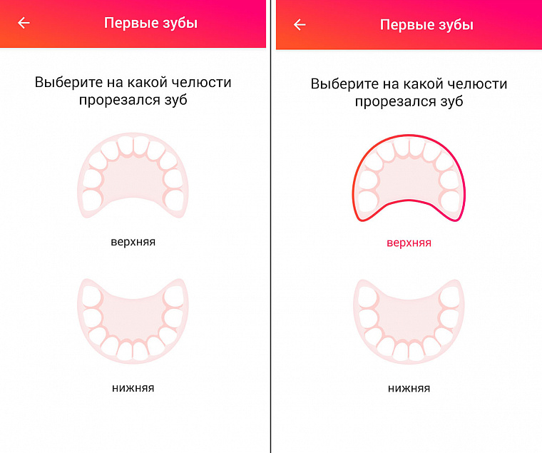 - Выбирайте верхнюю или нижнюю челюсть, в зависимости от того, где необходимо отметить появление зуба.