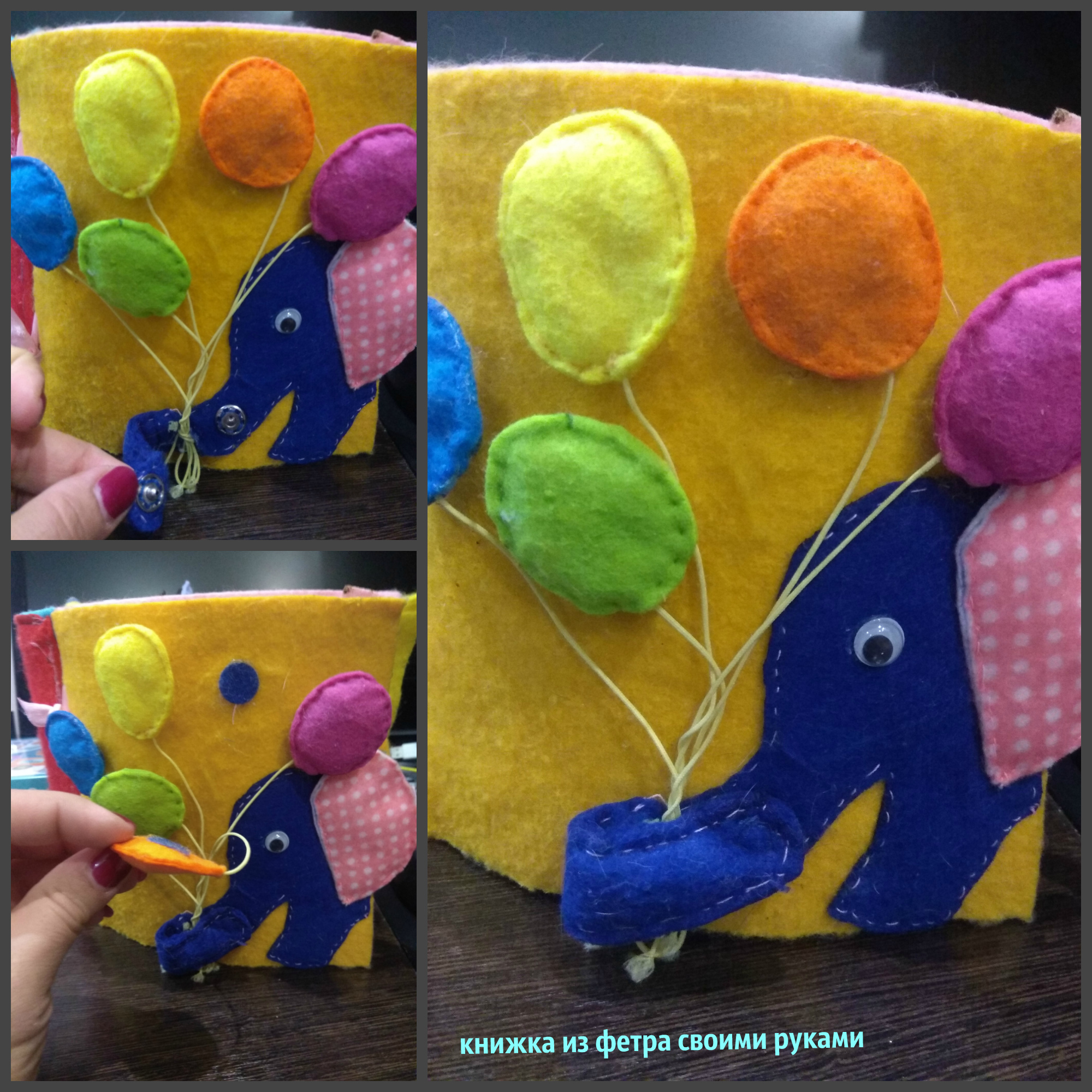 Первая страничка книги начинается со слоника, который держит шарики. Их можно легко менять местами и прощупывать содержимое. Я их заполнила разными крупами и пакетиками для шуршания. А чтобы слон удержал шарики своим хоботом, нужно согнуть хобот и закрепить его на кнопку.