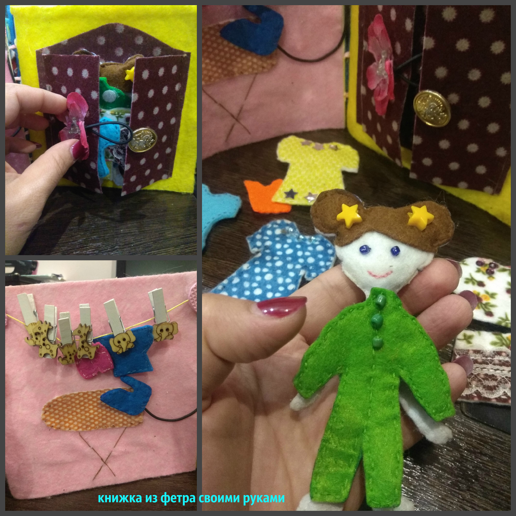 Очень понравился и вариант с кукольным гардеробом. В куклы дочка обожает играть. Поэтому решила начать свою страничку с куколки, которую надо будет одеть по погоде, погладить ей вещи фетровым утюжком и путешествовать вместе с ней по страничкам книги.