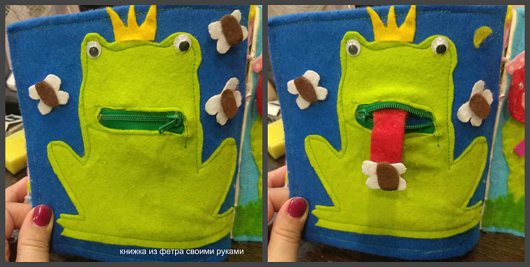 На другой страничке сидит лягушка, она ловит комариков язычком. Чтобы достать язычок, нужно открыть молнию. С первого раза не получилось открыть её. Хорошая тренировка для пальцев рук.