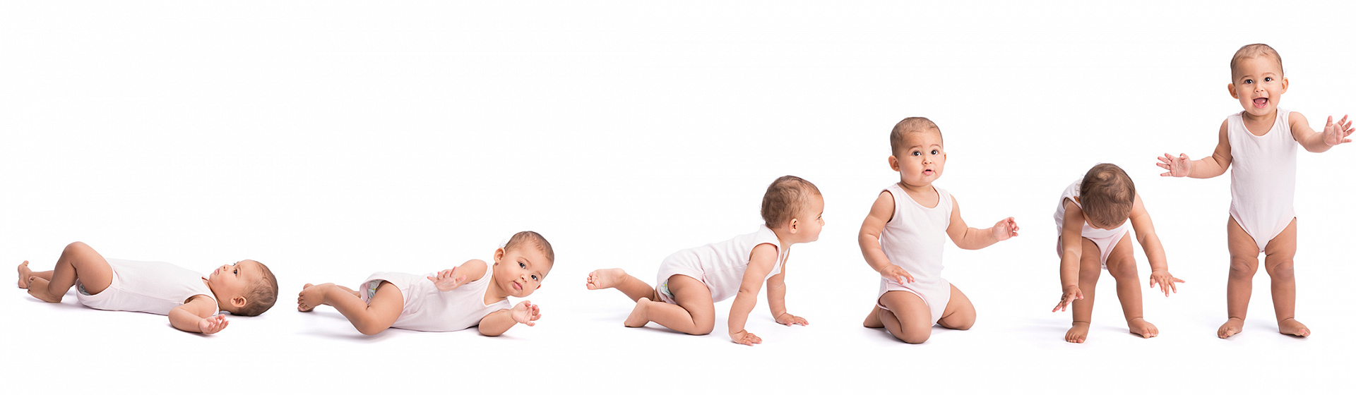 В первый и второй месяц ребёнок умеет поворачивать голову, приподнимать её, лежа на животе. К двум месяцам он умеет сжимать и разжимать пальцы, игрушку, удерживает голову около 10 секунд. В три месяца переворачивается со спины на бок, с живота на спину. В вертикальном положении держит голову и туловище. На четвёртом месяце малыш может, лёжа ни животе, подниматься на руках. Из лежачего положения при поднятии за ручки удерживает голову. Если держать малыша под мышки на плоской поверхности, то он будет переступать ножками. К пятому месяцу игрушки тянутся в рот и рассматриваются. В этот же период ребёнок умеет поднимать ножки, хватать их руками, поднимать голову и плечи, пытаться сесть, перекатываться со спины на живот, может даже недолго сидеть. Когда его держат в вертикальном положении, опирается на стопы, умеет перекладывать игрушки из одной руки в другую. В возрасте около полугода ребёнок садится, становится на четвереньки, пробует ползать. Некоторые дети сразу пытаются встать на ноги. Умения улучшаются к девяти месяцам. С девяти до одиннадцати месяцев дети обычно могут сами вставать, ходить, придерживаясь рукой, перемещаться приставными шагами.