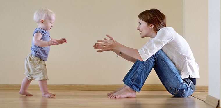 На начальном этапе обучения ходьбе разместите предметы поддержки в доступе к его траектории движения. Ходите за ним, чтобы быть «на подхвате». Не мешайте его тренировкам, он должен научиться удерживать вес тела, в этой работе участвует и мозг и даже внутренне ухо. Для закрепления первых навыков малышу могут быть полезны движение танца, помогите ему подвигаться под музыку. Хорошим упражнением станет перешагивание через маленькие препятствия, повороты в движении. Побуждающим мотивом к тренировкам ходьбы будет исследование дома. Пусть малыш будет ходить по маршруту от одной игрушки к другой.