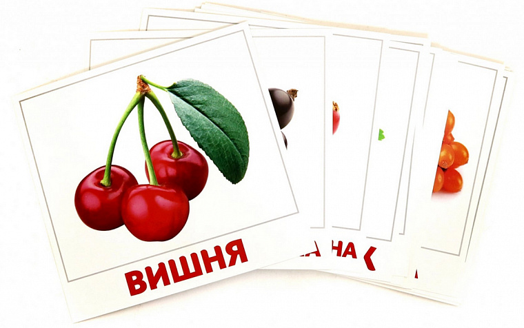 Первое, что нужно ребёнку, — это карточки Глена Домана. Сначала можно брать самые простые: фрукты, цвета, геометрические формы. Для деток постарше есть и профессии, музыкальные инструменты, эмоции и прочие.