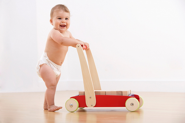 - Отлично работает упражнение с коляской. Уже с 9 месяцев можно ставить её перед ребёнком так, чтобы он держался за неё, потом аккуратно её двигать. Это заставляет малыша тоже двигаться вперёд;