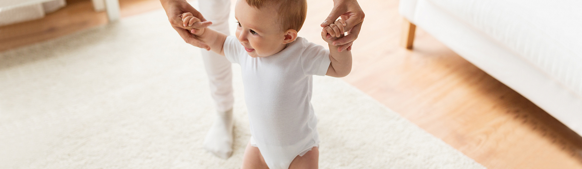 - Ходьба с малышом с поддержкой для обучения равновесию. Кисти руки ниже плеч или на их уровне. Когда малыш уверенно ходит с поддержкой двух рук, можно пробовать водить его за одну руку;