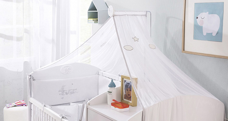 - Балдахин – хорошо выглядит, но мешает и крохе, и маме (усложняет подход к малышу), не защищает ни от чего, даже от комаров. Очень быстро накапливает пыль.