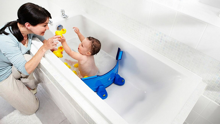 - Для ванных дел придуманы удлинитель на кран, насадка, предупреждающая об изменении температуры – цветом, шапочки для купания, которые исключают попадание воды в глаза. Уже в продаже ограничители в ванную: чтобы не наполнять всю ёмкость, а только нужную часть. Многие испробовали всевозможные силиконовые коврики, чтобы ребёнок не скользил, и шезлонги, и подушки для купания новорождённых.