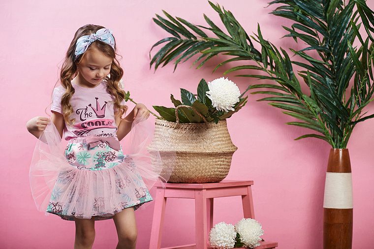 Добавим запасной комплект на случай «повреждения» первого и для подвижных игр – трикотажное с модным принтом и фатиновой юбочкой. Под низ – легинсы.