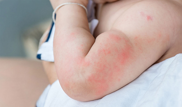 - Когда кишечник только заселяется, выделяются токсины, поражающие в том числе кожу, поэтому у новорождённых на 3-5 день бывает эритема – сыпь на локтях, коленях, вокруг суставов.