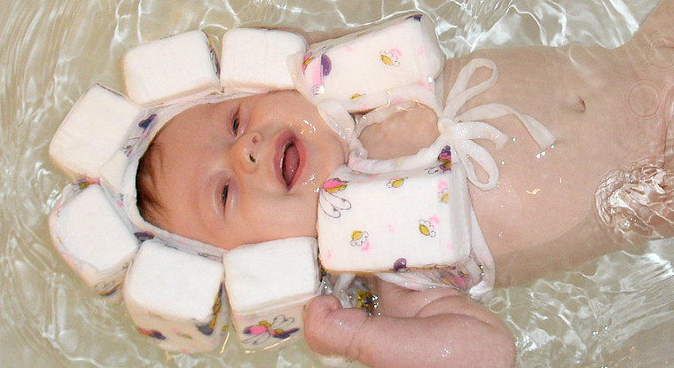 Верхний край обшитого пенопласта будет как бы возвышаться над головой крохи. Ребёнок в таком чепчике похож на Чебурашку. Кстати, сегодня, аналогичные чепчики для купания продаются в магазинах и стоят недорого. В течение семи-восьми дней постепенно уменьшайте поддержку ребёнка рукой и таким образом малыш научится сам держаться на воде. После месяца в таком поддерживающем чепчике его можно снимать, ведь ребенок должен уже научиться самостоятельно держать на воде голову.
